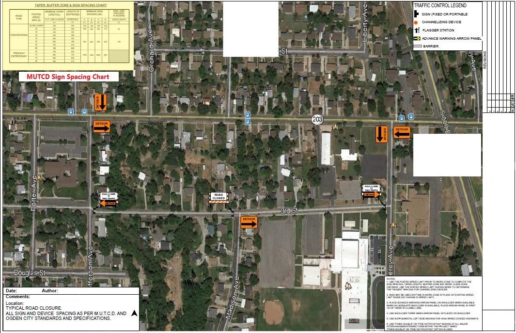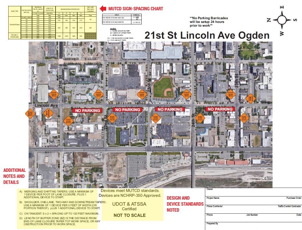 In order to reduce liability for both the city AND the contractor, Ogden City will only accept traffic control plans that are designed and drafted to MUTCD standards.  In addition to setting up and taking down traffic control devices, most barricade companies are able to draw up a Traffic Control Plan.